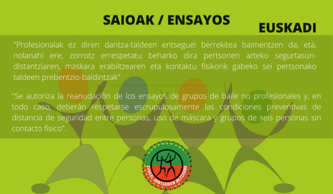 “Dantza-talde ez-profesionalen entseguei berrekitea baimentzen da, eta, nolanahi ere, zorrotz errespetatu beharko dira pertsonen arteko segurtasun-distantziaren, maskara erabiltzearen eta kontaktu fisikorik gabeko sei laguneko taldeen prebentzio-baldintzak.” Atzo atera zen dekretua, dantza taldeak baldintza zorrotzetan entsaiatzeko aukera ematen duena. Esteka honetan sakatuz, dekretu osoa ikus dezakezu: //www.euskadi.eus/…pdf
