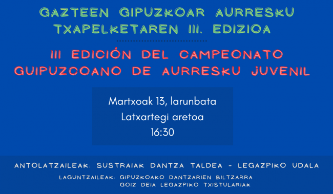 Datorren martxoaren 13an, larunbata, Latxartegi Aretoan, 16:30ean, Gazteen Gipuzkoar Aurresku Txapelketaren III. edizioa ospatuko da. Antolatzaileak: Legazpiko Udalak eta Sustraiak Dantza taldeak. 39 dantzari arituko dira, 2010 eta 2006 urte bitartean jaiotak. Dantzatu beharreko dantzak: • B Saila: “Erribera” eta “Zortzikoa” • D Saila: “Ehun Dukat” eta “Aurkez Aurke” edo “Desafioa” Epaimahaia Gipuzkoako Dantzarien Biltzarraren partaidez osaturik egongo da eta doinua…