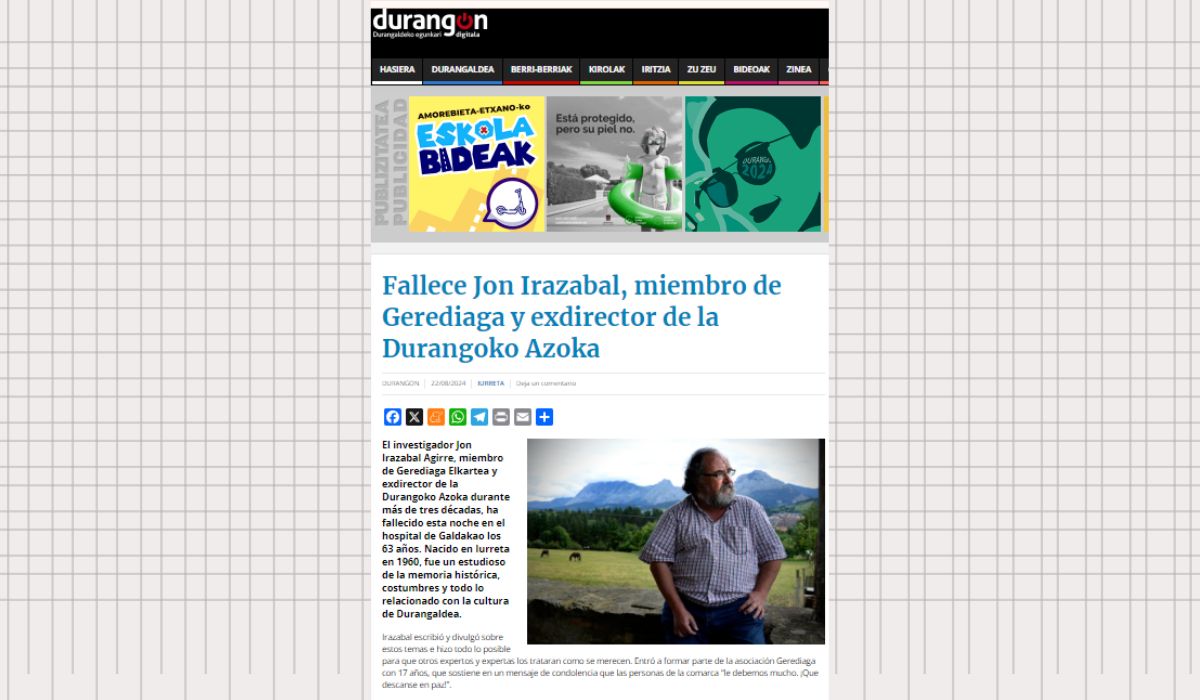 Jon Irazabal Agirre, Durangoko Azokako zuzendari ohia eta Gerediaga Elkarteko kidea, hil egin da. Iurretan jaio zen 1960an, eta memoria historikoa, ohiturak eta Durangaldeko kulturarekin zerikusia duen guztia aztertzen jardun zuen.
