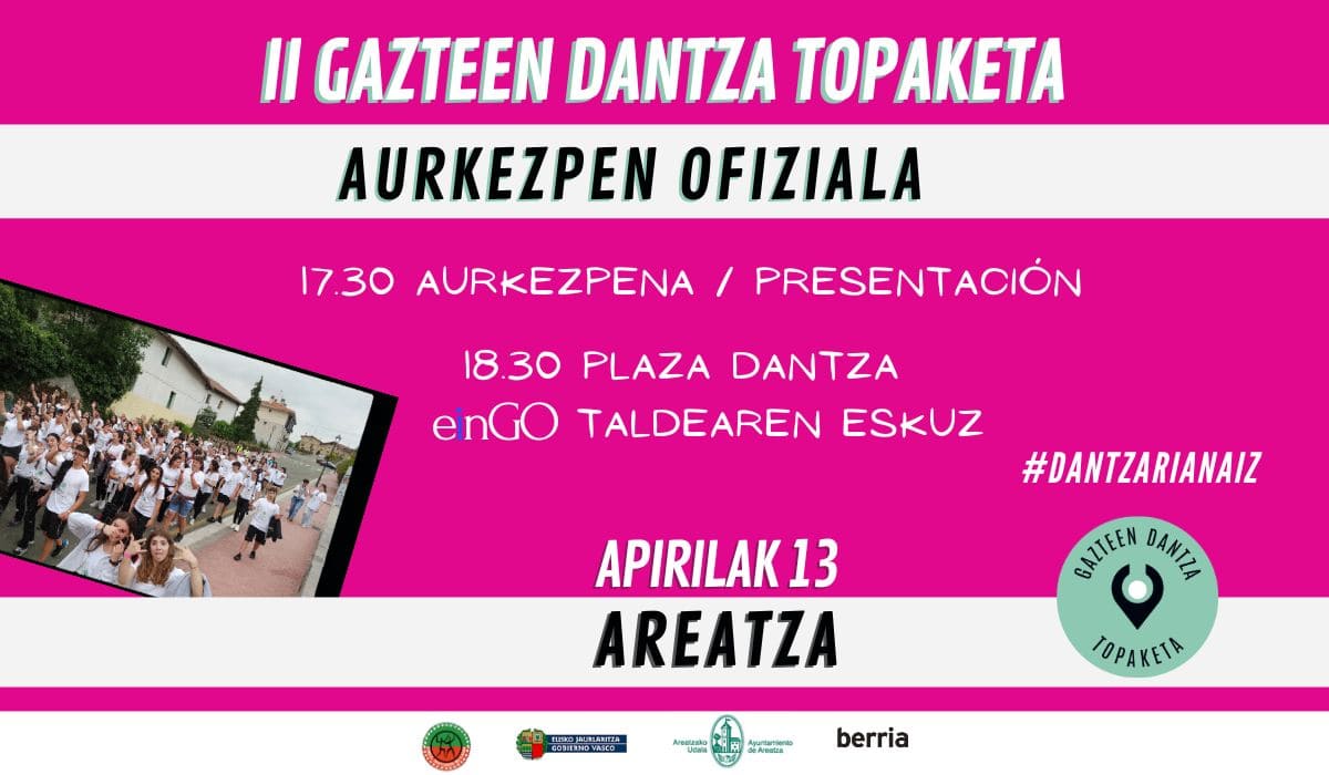 El sábado 13 de abril se celebrará en Areatza la presentación oficial de la II Gazteen Dantza Topaketa de Euskal Herria organizada por Euskal Dantzarien Biltzarra.